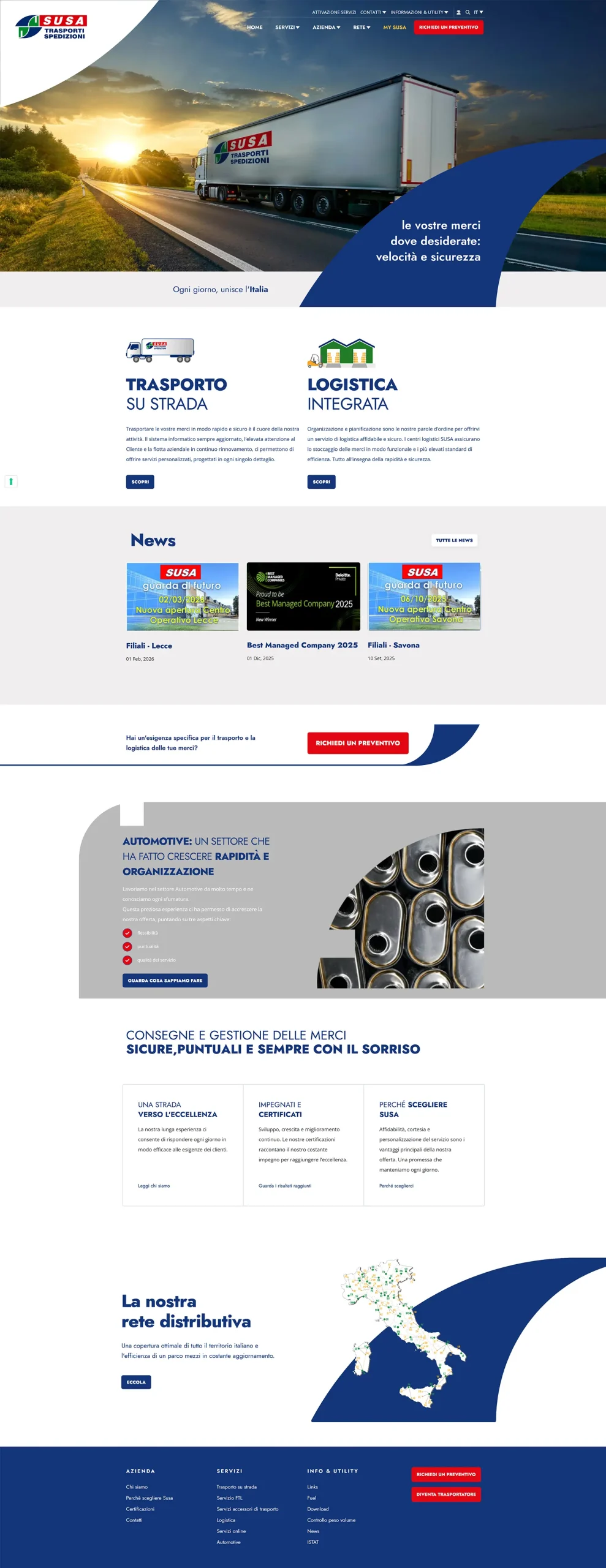 Susa è un’azienda che si occupa di trasporti e logistica con sede in Umbria, ma che opera su tutto il territorio nazionale. Grazie ad un sistema informatico sempre aggiornato, ad un approccio di elevata attenzione al Cliente e alla flotta aziendale importante, offre servizi completi e di alto valore aggiunto per molte aziende italiane.